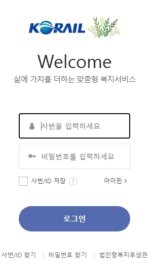 코레일 후생복지관을 이용하기 위해서는 코레일에서 운영하는 온라인 몰인 이지웰에 로그인합니다.