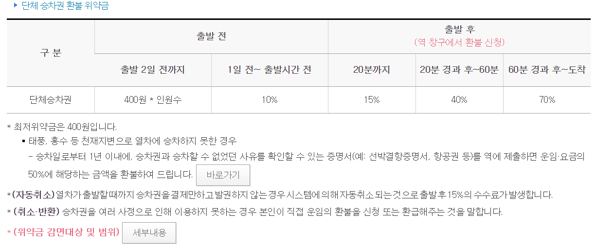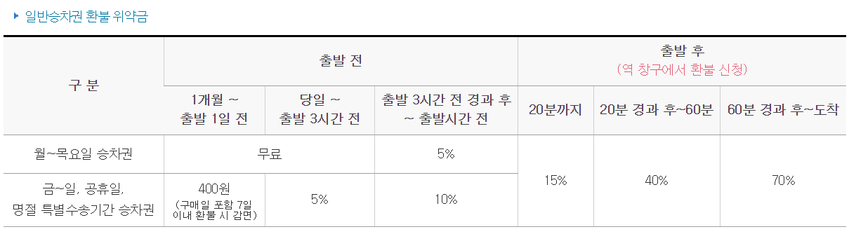 - 구입한 승차권을 환불하고자 하는 경우 환부신청시점에 따른 위약금이 발생합니다.